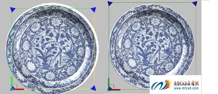 对盘底的图案要调整到位,那就击“贴图/平面贴图”功能,并按住Ctrl键激活盘底线圈,就可看到四角带“▲”形的放缩框,将其框住盘底,图案就归正了。接着,再对盘身图案调整到位,方法相同,归正的图示如插图4左所示。最后,对盘上边的圆环图案也调整到位。
