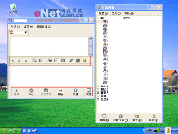 加入名单中的好友,只要上线,就可以立即在Gaim-好友列表的上线也面中看到。点击在线的好友头像便弹出聊天对话框,其中包括了字体大小,字体颜色及类型,少量的表情等。在对话框中敲入语句后点击发送按钮或按Enter键就可以完成消息的发送过程了。