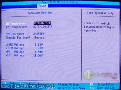 进入BIOS设置页面之后,可以找到一个叫“Hardware Monitor”或“PC Health”的选项(如笔者的机器是“Power > Hardware Monitor”。