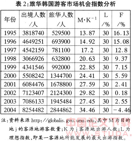 (二)市场潜力不大。韩国人口有限且是一个中等发达国家,因此韩国几乎不可能长期作为中国的第一大客源国。对此,用旅游机会指数进行计算便是一个很好的方法。旅游机会指数(F)是指某一客源地到某一目的地旅游人数占该客源地该类旅游的所有出游人数的实际比例与理想指数的差。当F=100%时,表明该客源地有最大的潜力可以发展;当F=0时,表示再发展该客源国旅游市场的潜力为0。对我国来说,韩国游客来华旅游市场的理想旅游指数应该为30%。1995年—2004年,该指数分别为16.13、15.08、12.8、9.37、7.15、5.59、2.41、0.18、2.55、-4.46(见表2)。特别是2004年所接待的外国游客数量已超出了理想的指数。但即使旅游人数的基数会增大,未来旅游的市场机会指数很难再扩大。