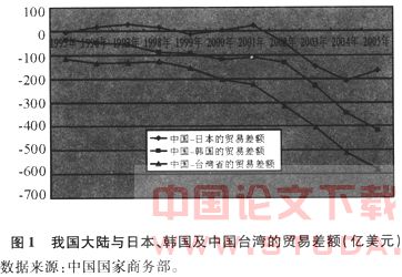 背离之一:日本、韩国、中国台湾等地对中国大陆的投资不断增长的同时,我国对以上国家和地区的贸易平衡却呈不断恶化之势。我们先来考察一下我国吸引外商直接投资的来源地构成。从中国吸引外国直接投资的来源地来看,除去香港地区以及维尔京群岛、开曼群岛等离岸金融中心之外,日本、韩国、中国台湾和美国是对大陆投资最多的国家和地区。如表1所示,近年来上述国家和地区对中国大陆的直接投资,除了个别年份有一定的波动外,基本上都呈明显的增加趋势。1999年,日本、韩国、中国台湾对我国大陆的直接投资额分别为19.6亿美元、12.7亿美元和26亿美元,到2004 年,以上三地对大陆的直接投资额则分别达到54.5亿美元、62.5亿美元和31.2亿美元。
