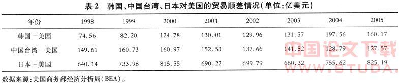 背离之三:我国大陆与韩国、中国台湾、日本的贸易逆差扩大的同时,上述三地对美国的贸易顺差却不断减少(或者至少是不再迅速增加)。尤其明显的是中国台湾对美国的贸易顺差自1999年以来持续减少,从160多亿美元减少到127亿美元(参见表2)。