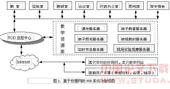 我们所要构建的基于校园网视频点播系统,功能框图如图2所示。各教室、实验室、教研室、行政办公室、会议室、图书馆、学生寝室等都装有计算机终端或带有机顶盒的电视终端,学校领导、教师、学生等都可以通过就近的终端,通过统一的界面,自主点播所需的多媒体信息和多媒体教学资源。这些信息和资源既可以是本校内的,也可以是其它学校或Internet上的信息和资源。