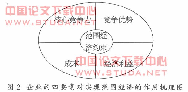 通过以上分析,总结得出企业所具备的核心竞争力、所形成的竞争优势、扩张过程中的成本、经济利益等四个要素在企业在扩张过程中实现范围经济的作用机理如图2所示。