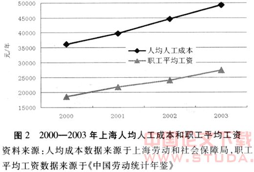 根据2005年人民银行研究局对全国部分地区企业人工成本的抽样调查结果,宽口径的人均人工成本要明显高于窄口径的“职工平均工资”。以上海地区为例,2000—2003年上海人均人工成本要远远高于同期职工平均工资,而且两者差额呈不断扩大之势(如图2所示)。按照目前的统计口径,会大大低估我国的劳动力成本。