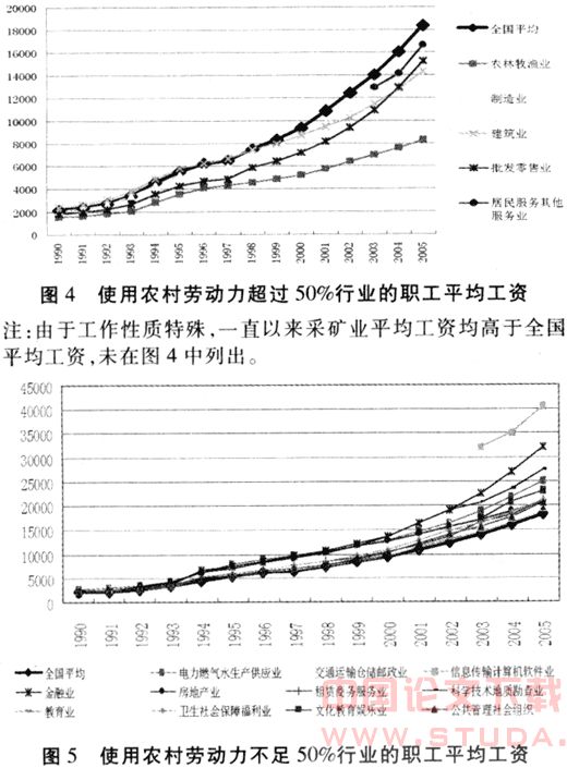 20世纪90年代初期,各行业“职工平均工资”差距不大,随着改革深入各行业收入差距逐渐扩大,“职工平均工资”呈发散形态。比较图4、图5可以看出,从90年代中后期开始,使用农村劳动力超过50%行业的“职工平均工资”在数量和增长速度上均落后于全国平均水平。而使用农村劳动力不足50%行业的“职工平均工资”在数量和增速上则高于全国平均水平。正是由于90年代后大量农民工进入制造业、建筑业、批发零售业、居民及其他服务业这些竞争性领域,大大压低了这些行业的平均工资水平,使得整个社会的劳动力成本产生分化,形成竞争行业和非竞争行业的二元结构。