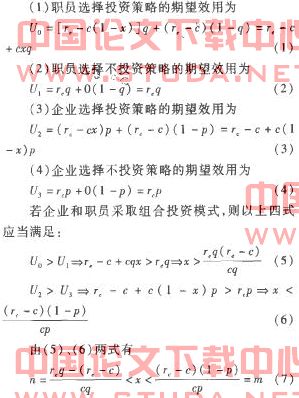 从理论上说,(7)式的意义在于企业能对自身的投资策略作出适当的调整,找出合适的投资比率。例如,在(7)式成立的情况下,职员若不考虑自身利益有意地不选择投资策略(即降低P),使得企业承担培训投资成本的比率上限变大,试图迫使企业承担更多的培训投资成本。此时,企业可以通过采用倾向于不投资的策略(如放弃部分利益使r减少来抵消职员行为对合作的破坏。本质上来看,这是理论上企业对职员威胁的应对策略。在决定培训投资成本各自承担的比率过程中还存在不少类似的情况。不过,职员能影响的变量只有P与r,企业能影响的变量只有q与r根据(7)式可知,当职员改变策略(即影响变量大小)试图改变不等式的取值范围时,企业都能找到抵消这种行为的影响的策略这样就能避免职员通过采取不理性策略的威胁,并规避因投资策略选择不当而产生的风险。