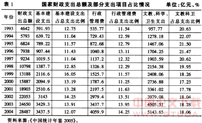 从表1可以看出,基本建设支出占国家财政支出总额的比例始终保持在12%左右的水平(这部分支出大量地反映在预算外),没有呈现较大幅度的下降;行政管理费占国家财政支出总额的比例,1978年为4.71%,1993年为11.54%,21304年上升到14.25%;文教科卫支出占国家财政支出总额的比例不仅没有增大,反而从1993年的20.63%下降至21)04年的18.06%。由此可以看出,政府对基本的公共服务的投入比重过低。