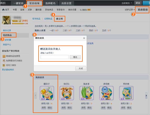 第二步:QQ空间商城的右边点击“装扮商城”“我的装扮”“我的物品”“藏宝阁”;藏宝阁下方“我的道具”页面,将会显示您目前拥有的道具类型及数量,点击“赠送”根据提示“输入QQ号”后,确认“赠送”即可。