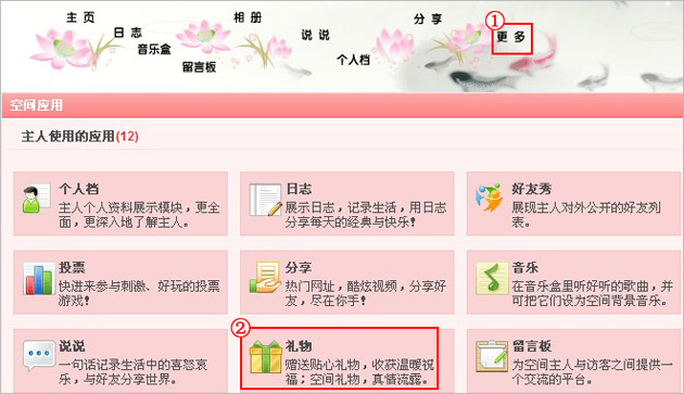 方法一:登录QQ空间后,点击导航上的“更多”“礼物”;