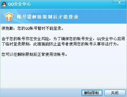 如果QQ安全中心检测到您的QQ帐号存在异常行为,可能会对您的QQ帐号采取一些措施,如:登录QQ帐号时需要输入验证码、登录前需要先解除限制等,这样可以有效防止盗号者用恶意程序进行自动登录。